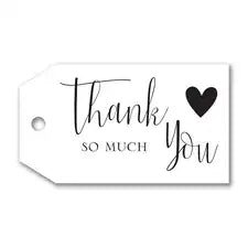Custom favor tags are a fun way to make your guests feel extra appreciated. The "Thank You So Much" design in black features a bold heart and digital printing, giving your gifts a stylish edge. Tags are pre-punched for quick and easy tying. Use them on treat bags, party favors, or mini gift boxes.